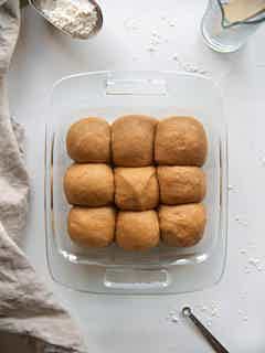 Grease 9x13 inch pan. Once risen, punch down dough and divide into 36 pieces. Roll pieces into balls and place into greased pan. Cover and let rise again until light and doubled in size, 30 to 45 min.